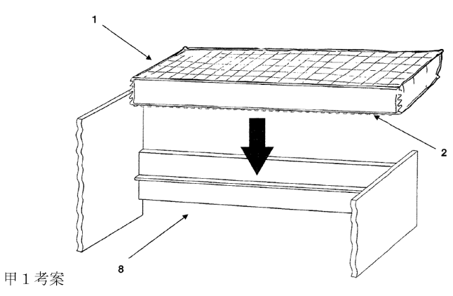 (ア)甲1考案におけるベッドマットレス1は、ベッドフレーム8の一部であるマットレス支持板の上に置かれているだけであり、マットレス支持板と離れないように続け合わされているものではない。そうすると、ベッドマットレス1の底部に固定されたスラット3(本件考案1における「支持板」に相当)が、ベッドフレーム8と離れないように続け合わされているとはいえず、その結果、スラット3は、ベッドフレーム8の一部であるヘッドボード及びフットボードと離れないように続け合わされているともいえない。