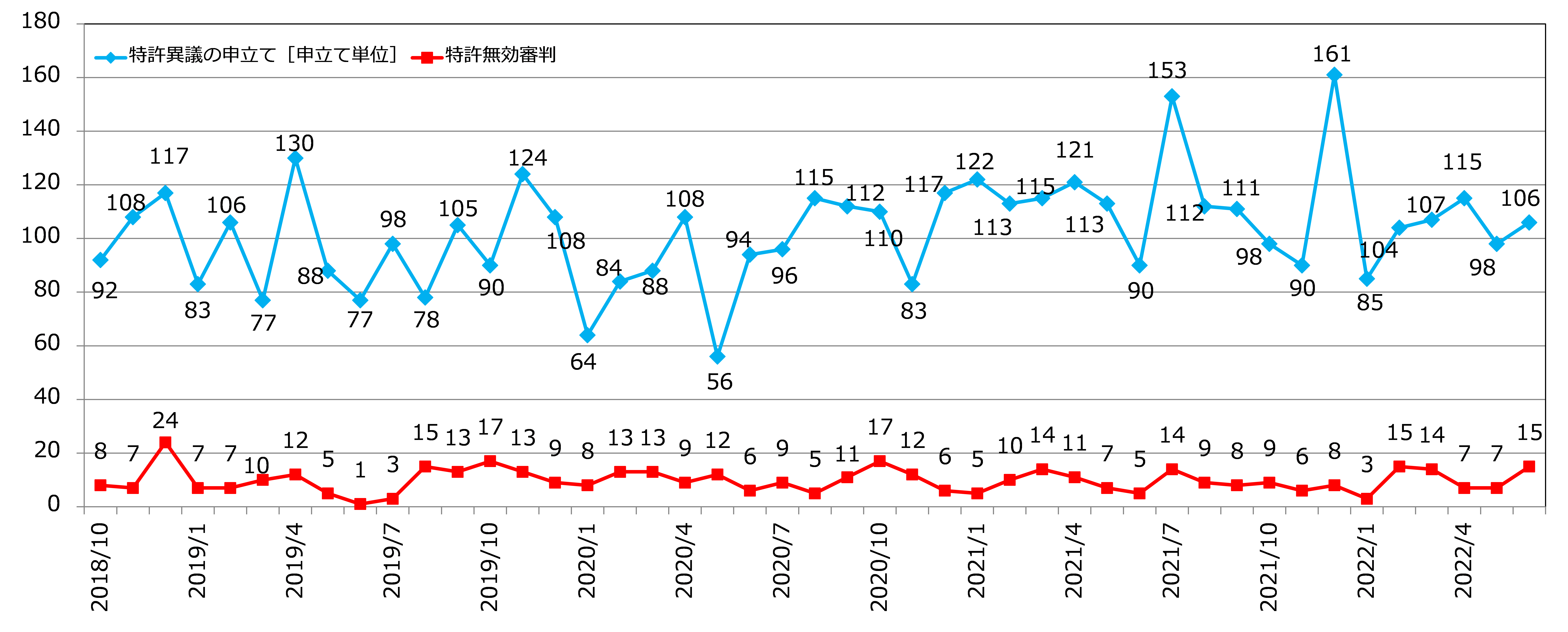 〈図1:特許異議申立件数・特許無効審判請求件数の推移(2018年10月~2022年6月)〉