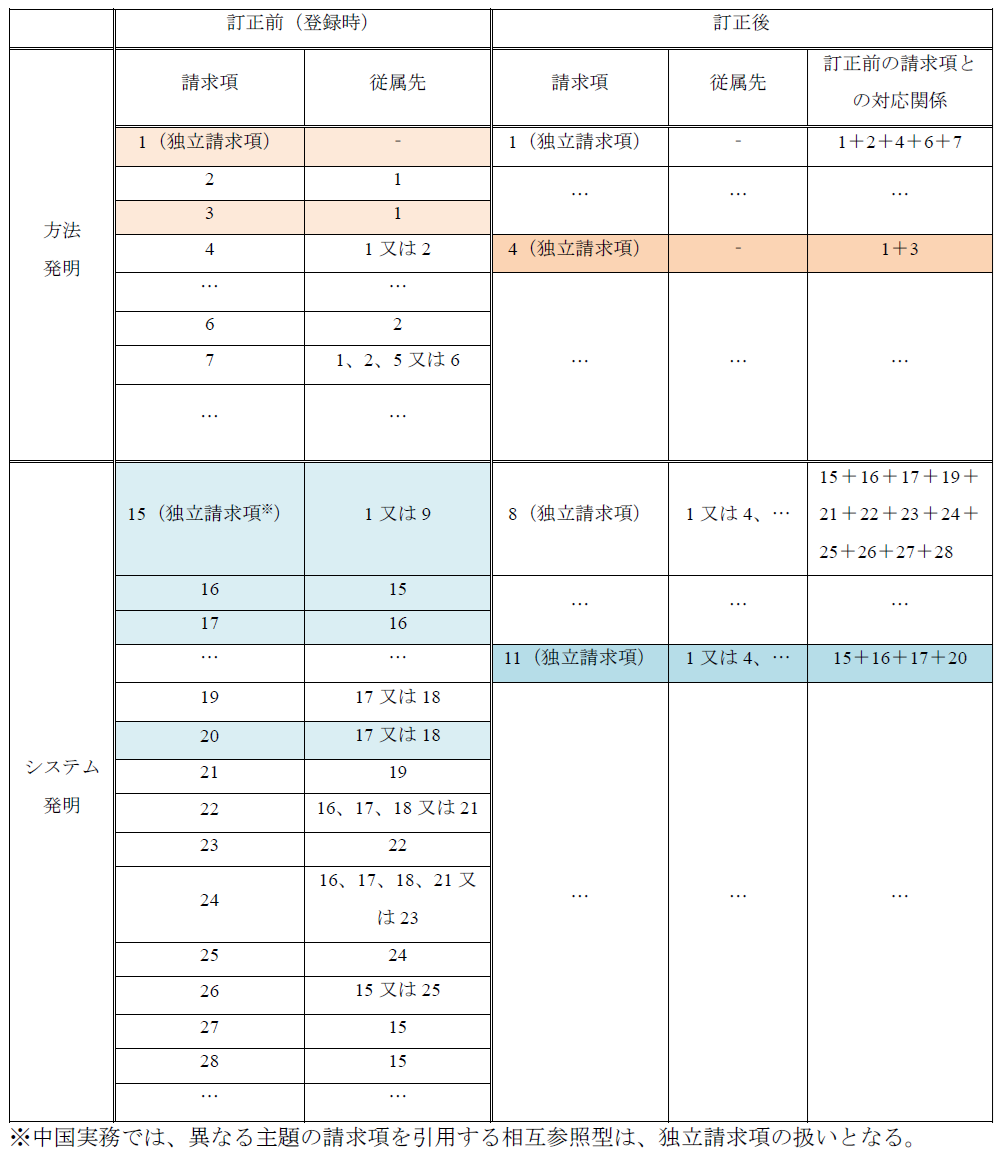 無効審判において、権利者は、訂正前の独立請求項15に更なる限定を追加することにより訂正後の独立請求項8を作成するとともに、訂正前の従属請求項20を独立請求項形式に書き換えて訂正後の独立請求項11とし、その参照先を「請求項1又は4、…」に変更した。