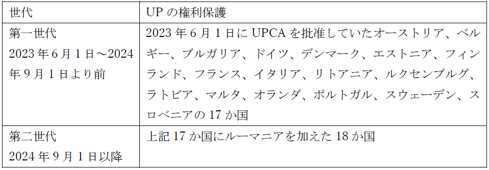 第一世代は、統一特許制度が開始された2023年6月1日にUPCAに批准していた17か国をカバーし、2024年9月1日以降の第二世代は、上記17か国にルーマニアを加えたルーマニアを含む計18か国をカバーすることとなる。