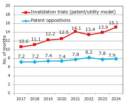 Trends in average trial duration are as shown below in FIG. 2. Concerning invalidation trials, FIG. 2 shows trial durations for both patent invalidation trials and utility model invalidation trials. The average trial duration for an invalidation trial is slightly on the increase, standing at 15.1 months in 2024.