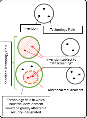 The specified technology fields and additional requirements here serve as guidelines for determining which inventions are subject to security review. “Specified technology fields” refers to technical fields selected as areas that include inventions that could become subject to security designation, in view of whether both their public disclosure could pose a significant risk to the security of the nation and its citizens, and the effect on economic activity and innovation. Additional requirements refers to requirements other than the technological field, such as the circumstances of the invention, the entity engaged in the research and development, and the like.